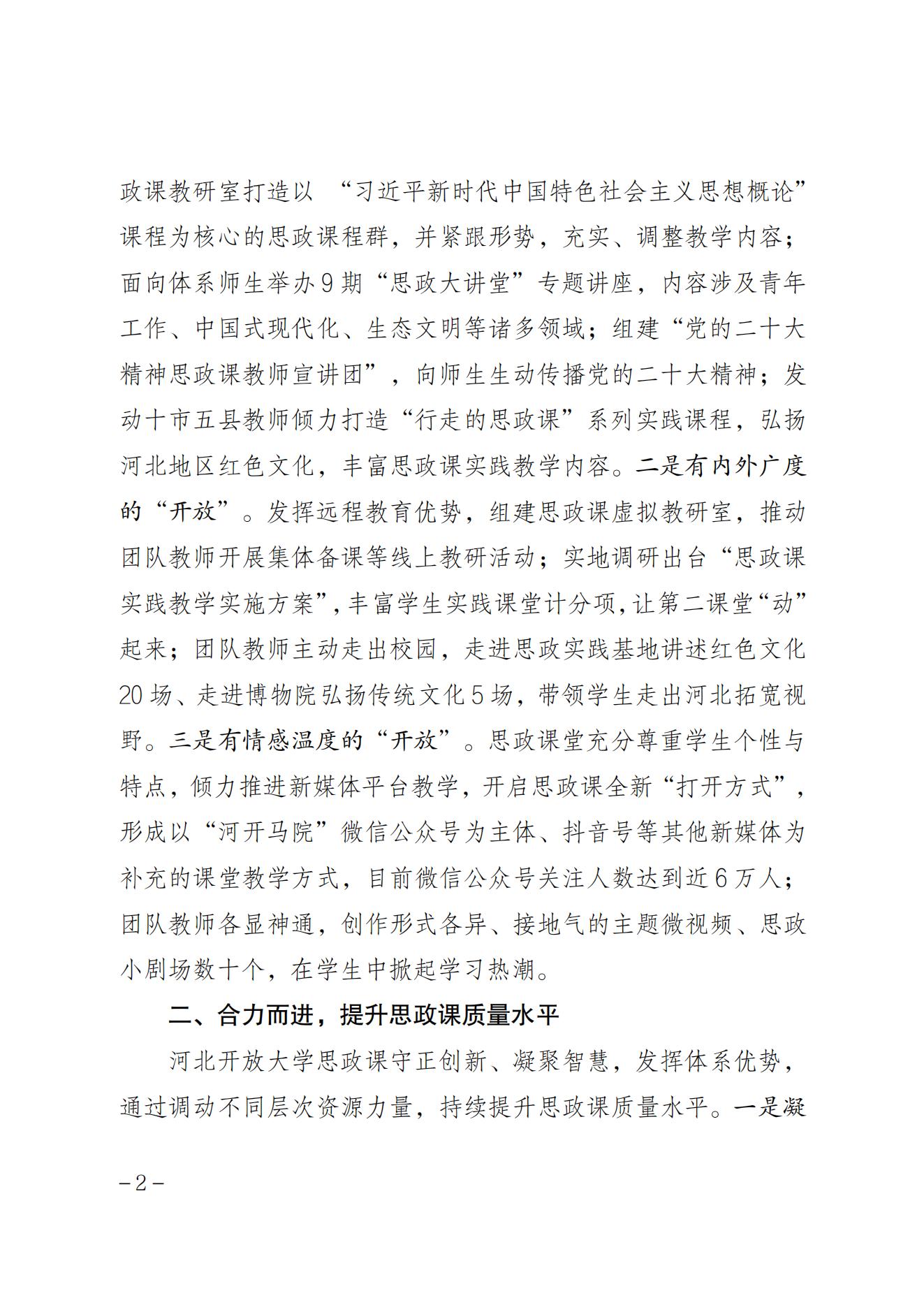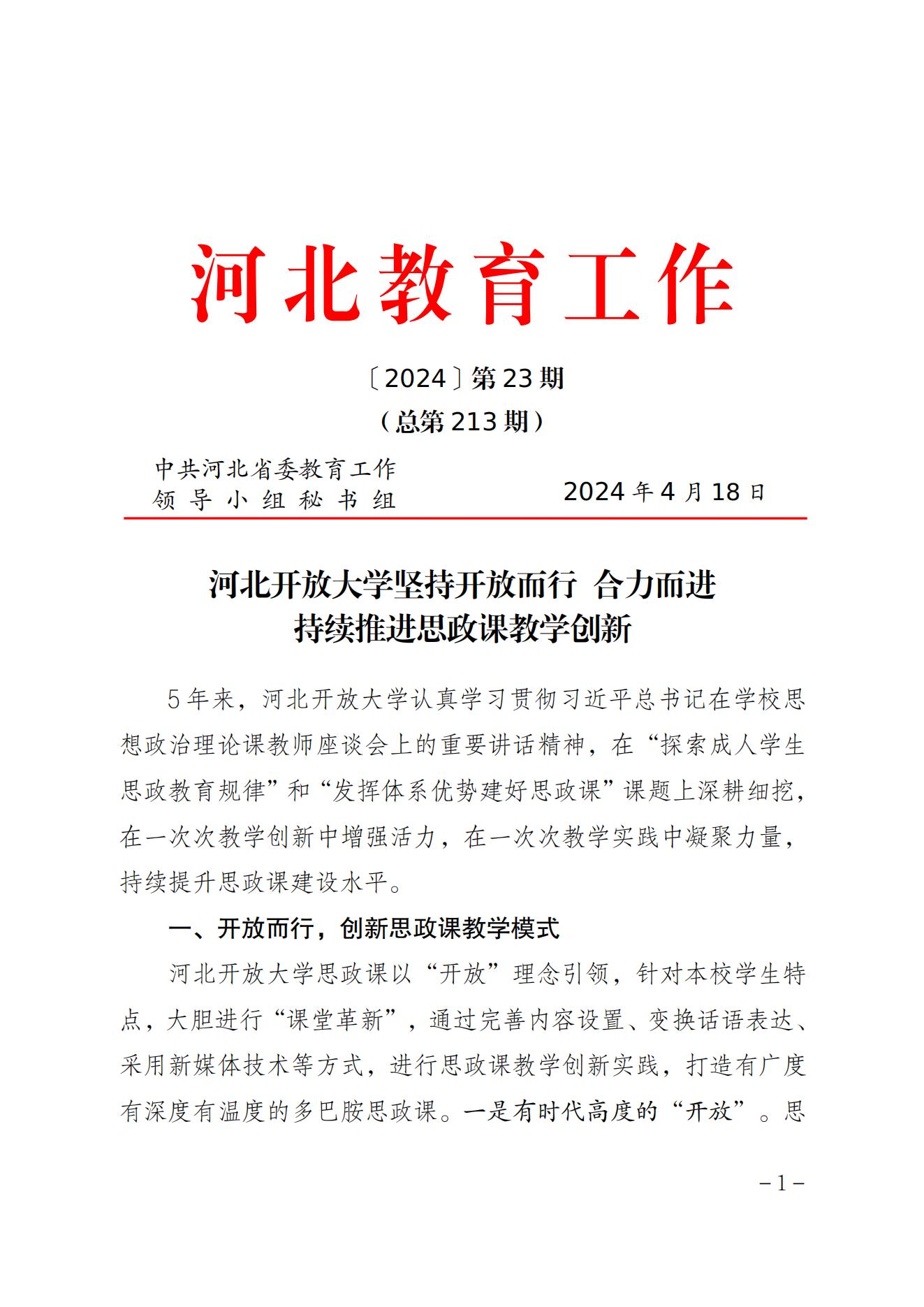 近日,河北教育工作簡報刊發我校思政課建設經驗和成果:河北開放大學堅持開放而行、合力而進,持續推進思政課教學創新。