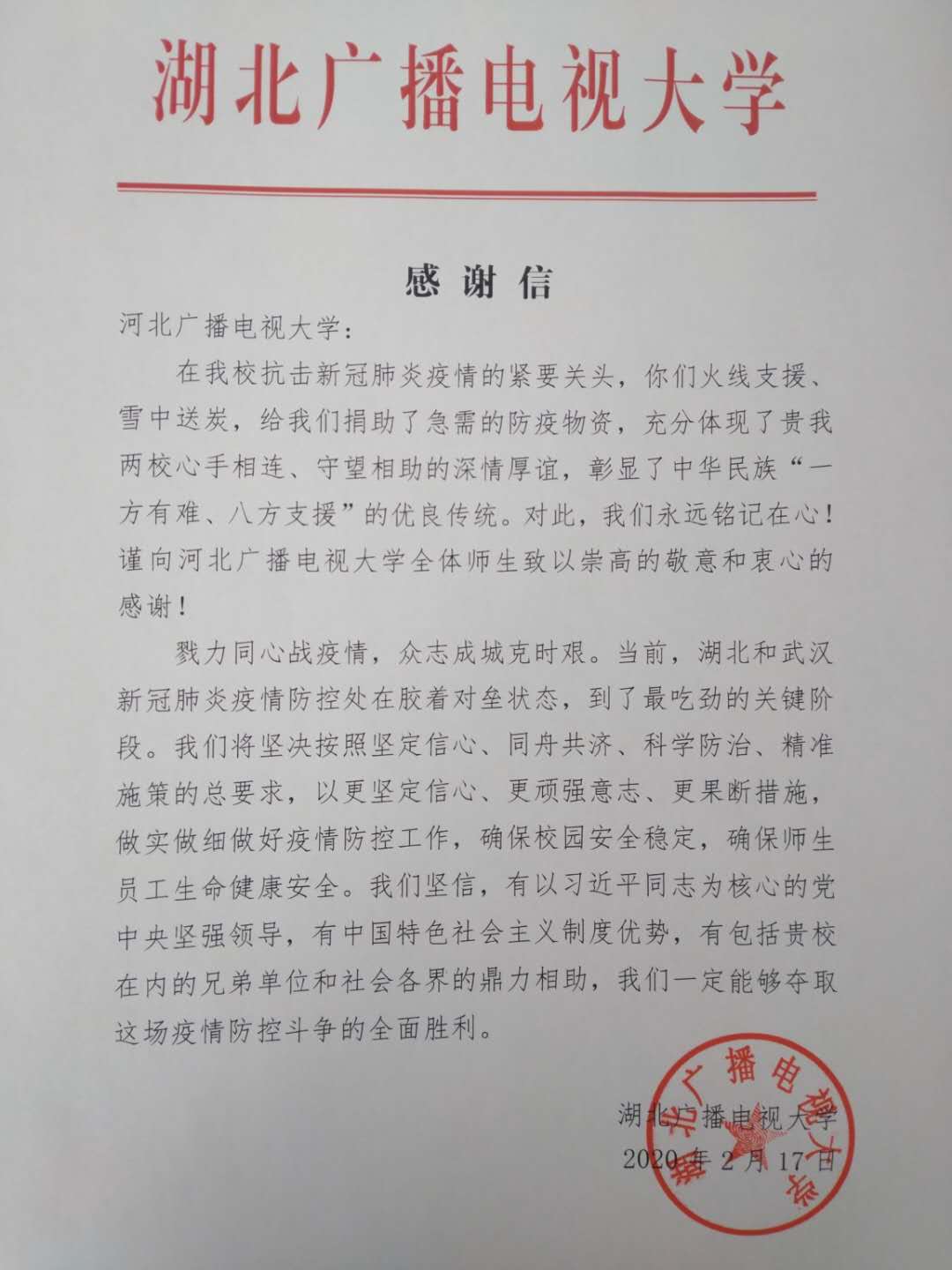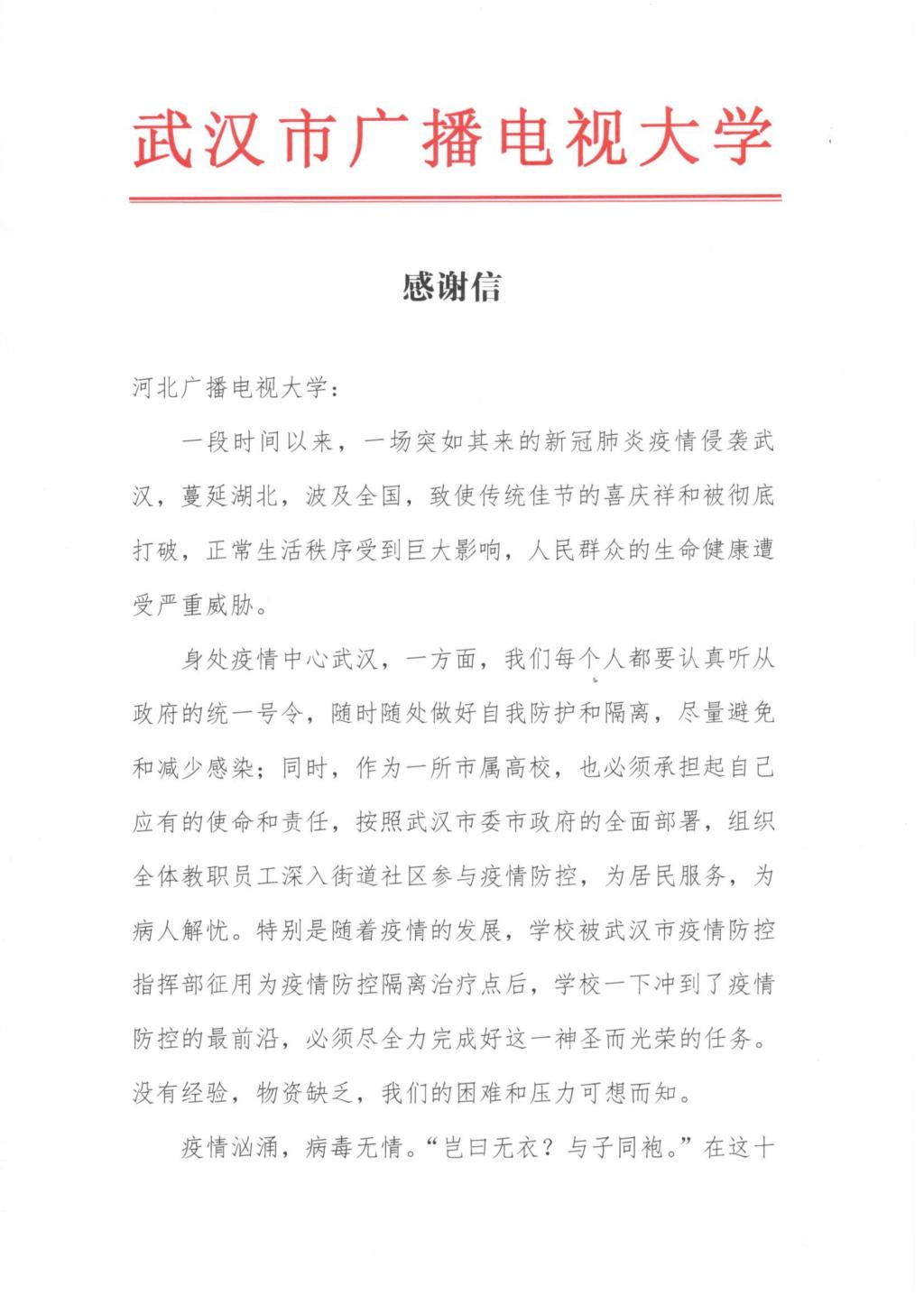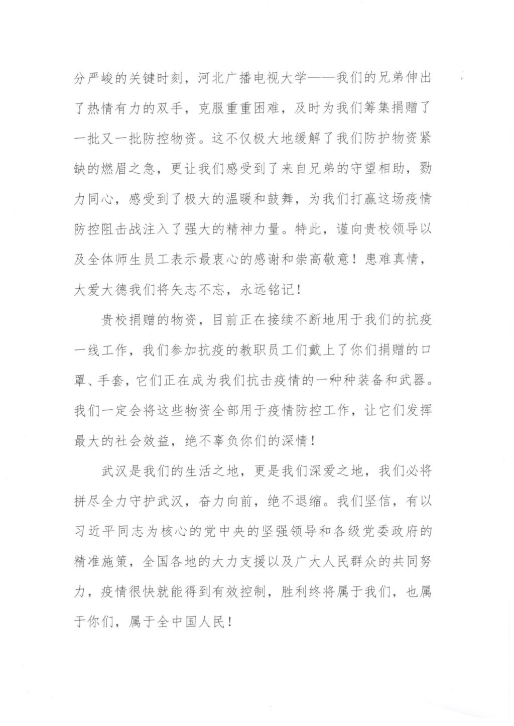 近日,我校收到湖北廣播電視大學(xué)和武漢市廣播電視大學(xué)的感謝信,信中說,“在抗擊新冠肺炎疫情的緊要關(guān)頭,”我?!盎鹁€支援,雪中送炭,捐助了急需的防疫物資”,體現(xiàn)了“兩校心手相連,守望相助的深厚情誼,彰顯了中華民族‘一方有難、八方支援’的優(yōu)良傳統(tǒng)”,“為我們打贏這場疫情防控阻擊戰(zhàn)注入了強(qiáng)大的精神力量”。向我校師生“致以崇高的敬意和由衷的感謝”,堅(jiān)信“有以習(xí)近平同志為核心的黨中央的堅(jiān)強(qiáng)領(lǐng)導(dǎo)和各級(jí)黨委政府的精準(zhǔn)施策,有中國特色社會(huì)主義制度的巨大優(yōu)勢”,有包括我校和社會(huì)各界的鼎力相助,一定能夠奪取疫情防控斗爭的全面勝利。