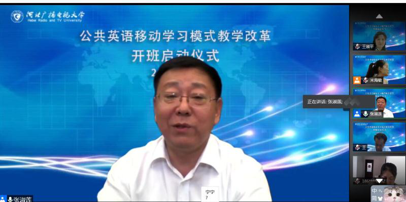 5月23日上午,我校通過騰訊會議在線舉行河北分部公共英語移動學習模式成果推廣試點項目開班啟動儀式。校黨委常委、副校長郭立志,國家開放大學國際語言文化教學部副部長鄭霽鵬,公共外語教學中心副主任熊英、劉寧,邯鄲廣播電視大學黨委書記、校長李守新,副校長王志安應邀出席啟動儀式。試點項目教學團隊所有成員以及參加試點項目的全體學生參加了啟動儀式。儀式由教學支持部主任張淑蓮教授主持。