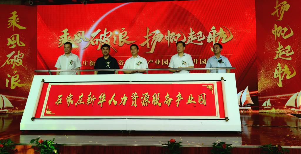 段潤保、李金輝、王德慶、劉建芳、劉振乾共同為石家莊新華人力資源服務產業園揭牌。