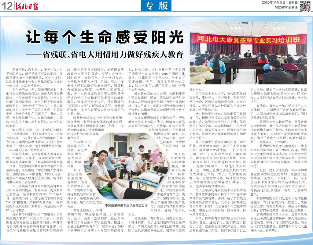 11月5日,河北日報和河北新聞網同步報道了我校的特殊教育工作。我校特殊教育學院自2013年成立以來,在省殘聯的大力資助下,在學校黨委的正確領導下,一直致力于探索殘疾人現代遠程開放教育,滿足殘疾人多樣化學習需求,并不斷開創辦學新局面,逐步構建起包括中專、專科和本科在內的比較完整的殘疾人遠程教育體系。用非常之力,竟非常之功,通過近年來不斷完善平臺資源、落實教學過程、加強導學助學服務、豐富校園文化活動和加強實訓等措施,辦學聲譽和教學質量不斷提升,并多次得到省殘聯的高度認可。