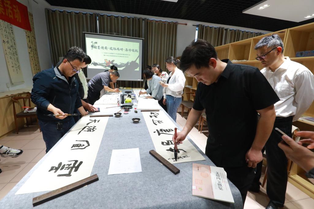 講座結束后,王凱旋教授現場揮毫,創作《以筆為犁,深耕社區》《敬學廣惠 ,有教無類》《翰墨薪傳》等作品,筆走龍蛇,墨韻悠長。在隨后的精品課堂上,王教授對社區學員的書法作品進行了細致的點評和示范。兩地共四十余名書法愛好者參與了本次教學活動。