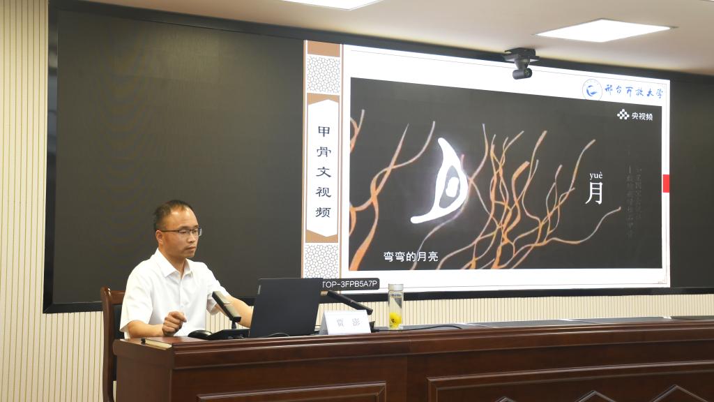 賈老師首先對甲骨文的產生進行了介紹,通過甲骨文微視頻“商朝人的一天”形象還原了商朝先民生活圖景,帶領聽眾穿越時空觸摸青銅時代的文明溫度。在學術溯源環節,他詳細介紹了甲骨文的發現歷程,從龍骨階段、收藏考釋階段和科學研究階段進行了深入淺出的講述。最后,賈老師深刻剖析了甲骨文研究的當代意義和文化溯源,將甲骨文化與邢臺地區的歷史文獻進行印證,闡述甲骨文中的邢臺印跡,對厚植邢臺文化根脈,增強邢臺文化底蘊,打造邢臺文化名城,實現文化興市戰略,具有重要的現實意義。