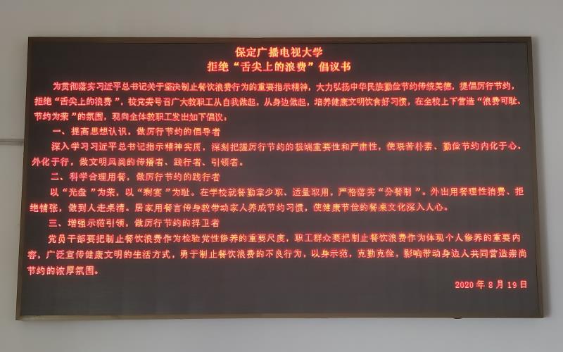保定電大通過向全體教職工發出倡議書,引導廣大師生做文明風尚的倡導者、踐行者、捍衛者;通過在食堂滾動播放宣傳視頻,以總書記“糧”言提醒大家愛惜糧食、珍惜食物,拒絕“剩”宴,形成節儉、文明、營養、健康的用餐氛圍。