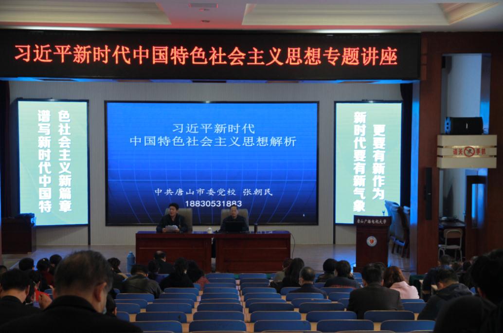 為使廣大教職工深入學習習近平新時代中國特色社會主義思想,11月11日,唐山電大在報告廳舉行習近平新時代中國特色社會主義思想專題講座。特邀請市委黨校副校長張朝民教授講授,黨委書記、校長郝廣友,黨委委員、副校長牟景文,黨委委員、紀委書記吳萬林出席講座。講座由黨委書記、校長郝廣友主持。